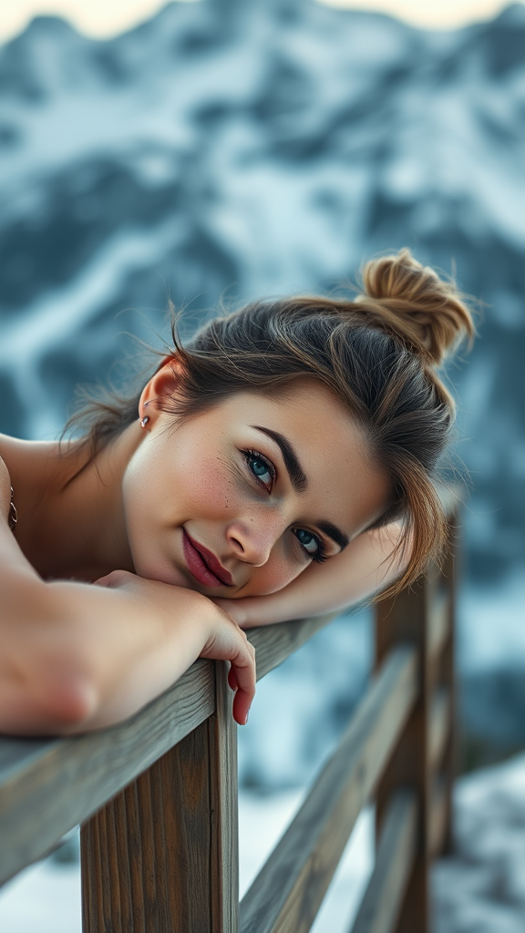RAW portrait, stunning German woman, 24 years old, resting on a wooden railing, hair in a casual messy bun, snowy mountains as backdrop, face detailed with natural skin and freckles, captured in 8k ultra-clear realism, cinematic lighting, high resolution, professional color grading with subtle film grain, elements of realism emphasized, avoiding any deformations or distortions.