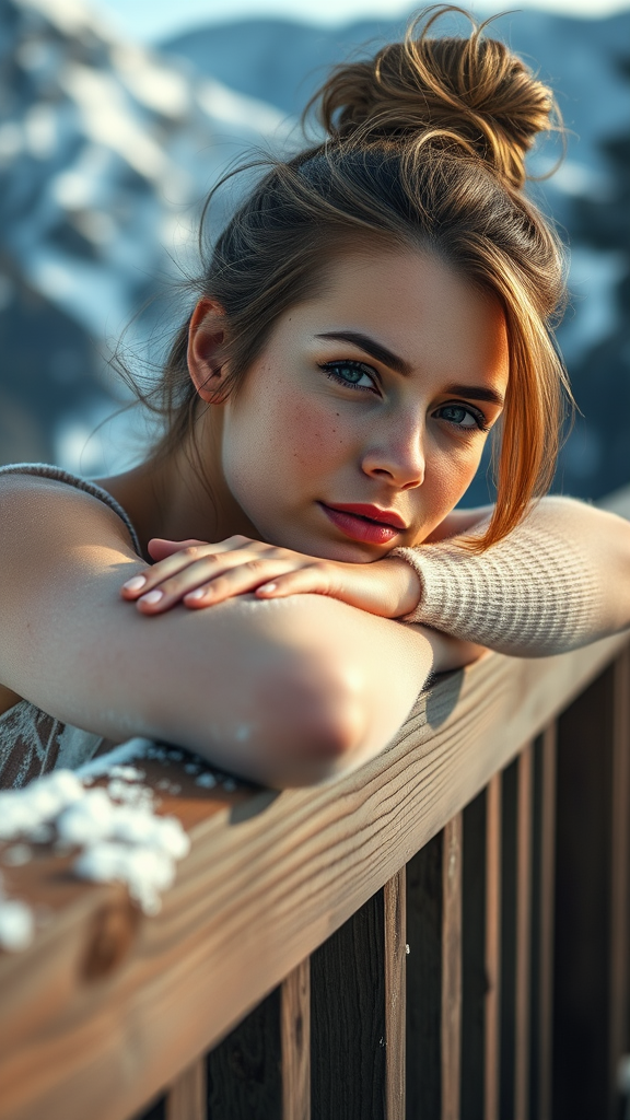 RAW portrait, stunning German woman, 24 years old, resting on wooden railing, messy bun hairstyle, snowy mountains in the backdrop, detailed facial features, natural complexion with freckles, captured in 8k ultra-clear realism, cinematic lighting, high resolution, expertly graded colors with subtle film grain, serene expression, natural pose, high-quality anatomy capture, elegance and grace in composition, untouched natural beauty, winter scene ambiance, professional composition.