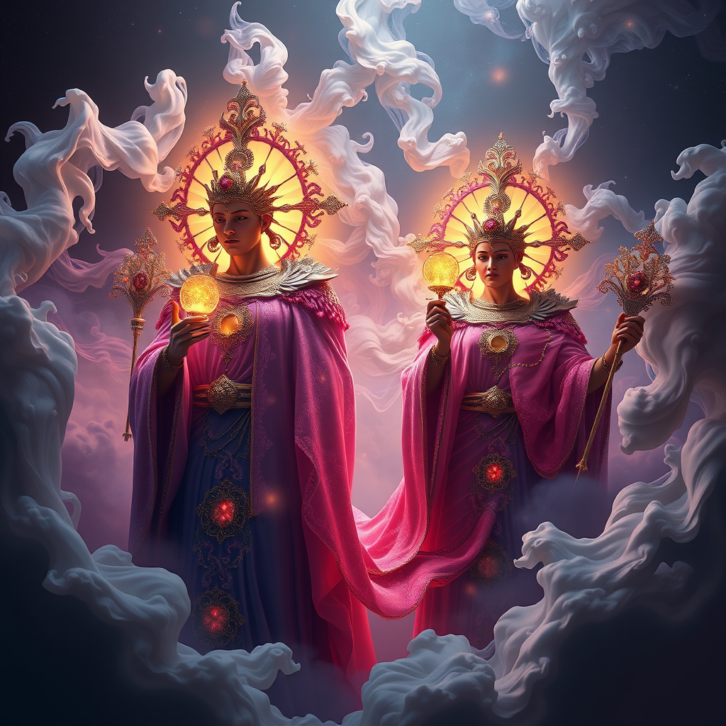 Raytraced render and digital painting depicting humans evolving into ethereal biological deities adorned with cosmos-like garments, clutching sacred emblems, inspired by Greg Rutkowski, Michelangelo Buonarroti, and Rembrandt, with neoclassic and classical influences. The scene is celestial and cosmic, exuding luxury, elegance, and intricate detail. Vivid and vibrant hues meld with smooth, soft billowing smoke, contrasting between darkness and bright heavenly light. Ethereal swirls, cosmic flowers, nebula vines, and twirling nebula trees create a mystical atmosphere. Cinematic and surreal, the artwork embraces high contrast and HDR quality, with textures suitable for ArtStation and CGSociety. Created with Unreal Engine for hyperrealism, the scene is imbued with symbolism, emanating magic and mystique. The use of ZBrush and Octane renders a bokeh effect and depth of field, enhancing the obscurity and wonder of the scene.