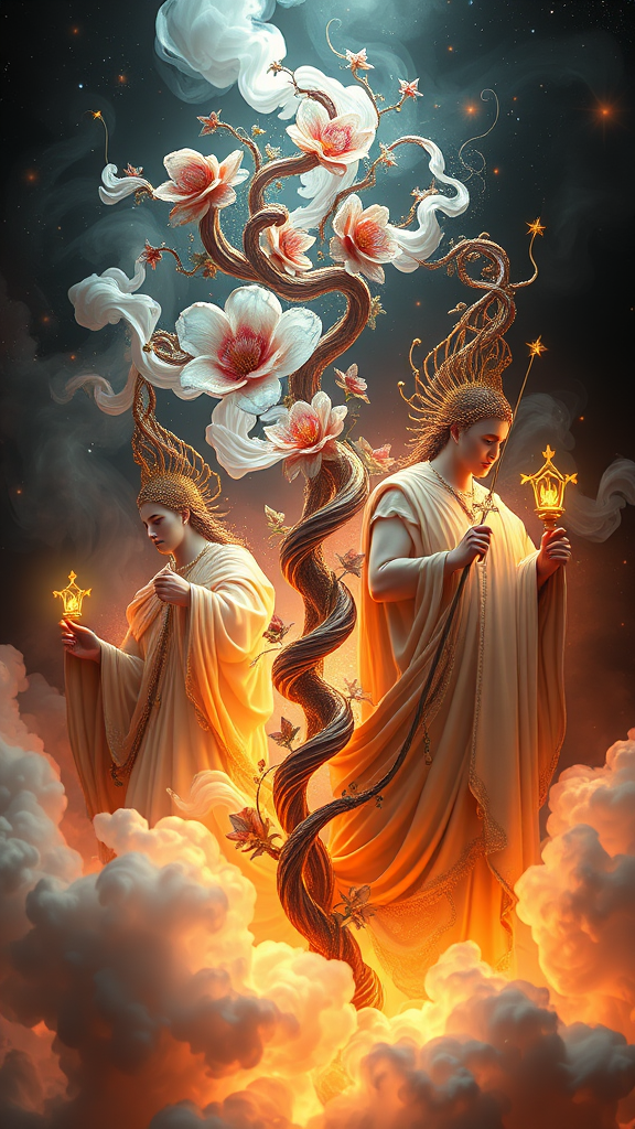 Raytraced render and digital painting depicting humans transforming into ethereal, modest biological gods adorned in cosmos as clothing, each holding a distinct holy symbol. Influenced by the styles of Greg Rutkowski, Michelangelo, and Rembrandt, this neoclassic, classical artwork captures a celestial and cosmic theme. Luxurious and elegantly ornate, the scene is vibrant and vivid with smooth, soft billowing smoke intertwined with darkness and brightness, creating a heavenly ambiance. Swirling cosmic flowers and nebula vines twist around a nebula tree, exuding a sense of grandeur and cinematic flair. Unrealistic yet high-contrast and HDR, this piece appears on platforms like Artstation and CGSociety, invoking symbolism that feels magical, mystical, and mystifying. It is rendered in Unreal Engine with ZBrush and Octane, offering hyperrealistic bokeh and depth of field. No defects or distortions are present, creating a flawless depiction within the frame, capturing the viewer's imagination.