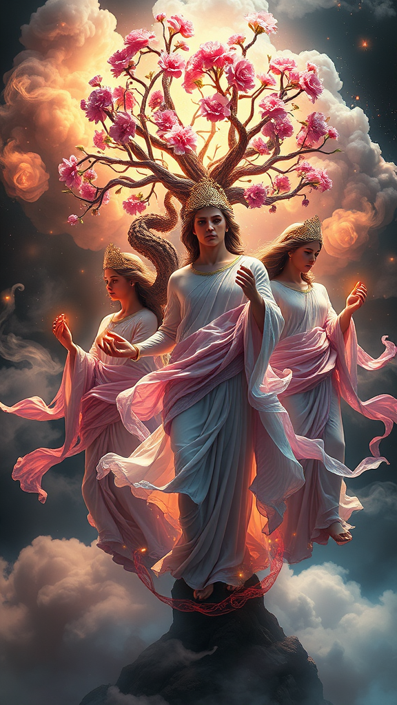 Raytraced render and digital painting of humans gracefully transforming into ethereal divine beings, adorned in clothing woven from the cosmos, each holding sacred symbols. Inspired by the artistry of Greg Rutkowski, Michelangelo Buonarroti, and Rembrandt, this neoclassical and classical piece exudes celestial luxury, with elegant ornate details. The scene is vibrant and vivid, featuring smooth, soft billowing smoke amidst an interplay of darkness and brightness, creating a heavenly atmosphere. Swirling cosmic flowers and nebula vines twirl around, entangling with a nebula tree, evoking a cinematic and unrealistic sense. The artwork is high contrast, HDR, and rendered in 4K, showcased on platforms like ArtStation and CGSociety, utilizing Unreal Engine. It embodies symbolism with magical, mystical elements, ensuring a profound and mystifying experience. The use of ZBrush and Octane lends it a hyperrealistic finish, enhanced by bokeh and depth of field, while introducing subtle creative variations.