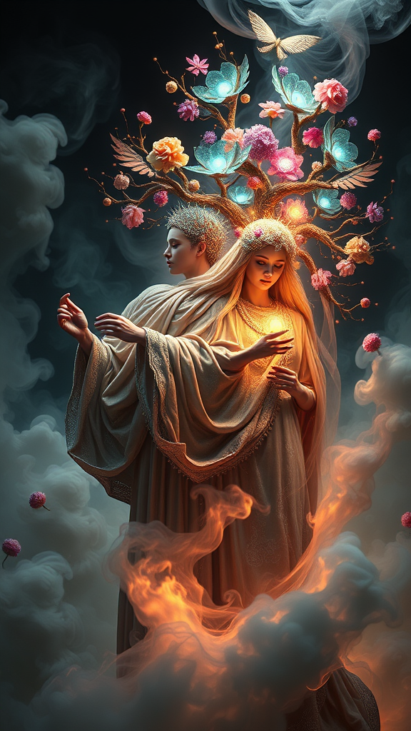 Raytraced render and digital painting of humans seamlessly transforming into ethereal, modest, and biological deities adorned in clothing woven from the cosmos, clutching sacred symbols. The artwork is masterfully inspired by Greg Rutkowski, Michelangelo Buonarroti, and Rembrandt, embracing a neoclassic and classical style with celestial and cosmic influences. The scene is luxurious, elegant, and ornate, featuring vibrant and vivid colors set against a backdrop of smooth, soft billowing smoke and contrasting with darkness and bright, heavenly light. Elegant swirls and cosmic flowers intertwine with nebula vines and a majestic nebula tree, creating a twirling, billowing atmosphere. The composition is cinematic and unrealistic, with high contrast and HDR quality, reminiscent of artstation and cgsociety caliber, enhanced by the power of unreal engine. Symbolism is woven throughout the piece, invoking a magical, mystical, and mystifying aura, with elements obscure and perplexing at times. The use of zbrush and octane brings a hyperrealistic touch, highlighted by a delicate bokeh effect and depth of field, resulting in a captivating and enchanting visual masterpiece.