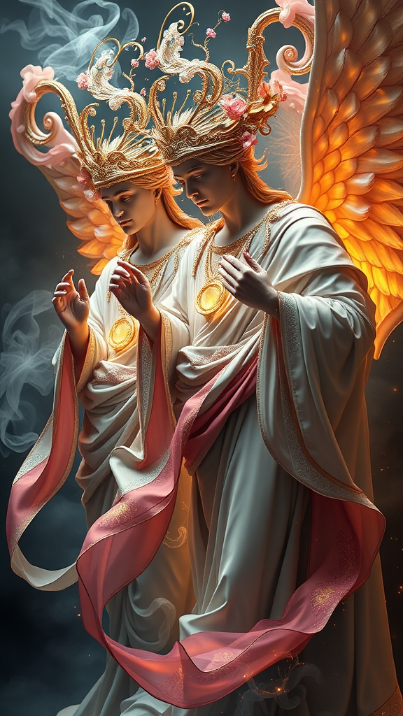 Raytraced render and digital painting of humans transforming into ethereal, modest biological gods, adorned in garments made of the cosmos, holding sacred symbols. Inspired by the styles of Greg Rutkowski, Michelangelo Buonarroti, and Rembrandt, the artwork embodies neoclassical and classical elements, featuring celestial and cosmic themes with luxurious, elegant, and ornate designs. The composition is vibrant, vivid, and smooth, interspersed with soft billowing smoke against a backdrop of darkness and brightness, creating a heavenly atmosphere. Elegant swirls, cosmic flowers, nebula vines, and nebula trees twirl and billow in a cinematic portrayal. The style is unrealistic with high contrast, HDR quality, crafted for platforms like Artstation and CGSociety, leveraging technology like Unreal Engine. Rich with symbolism, the portrayal is magical, mystical, and mystifying, a perfect combination of the obscure and perplexing, enhanced by tools like ZBrush and Octane for hyperrealistic detail with bokeh and depth of field effects.