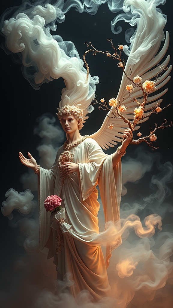 Raytraced render and digital painting of humans transforming into ethereal biological gods adorned with garments of the cosmos, holding sacred symbols. Inspired by the artistry of Greg Rutkowski, Michelangelo Buonarroti, and Rembrandt, this piece embodies neoclassic and classical styles with celestial and cosmic themes. Elegantly ornate and breathtakingly vivid, it's characterized by smooth, billowing smoke set against a contrasting backdrop of darkness and heavenly brightness. Intricate swirls form cosmic flowers, nebula vines, and trees that twirl and billow in a cinematic, unreal fashion. Featuring high contrast, HDR quality, and a nod to platforms like ArtStation and CGSociety. Enhanced with Unreal Engine, symbolism, and a magical mystique, the work is obscure and perplexing, rendered using tools like ZBrush and Octane for hyperrealistic detail. The scene employs techniques such as bokeh and depth of field to enrich its allure, offering a luxurious, elegant visual experience.