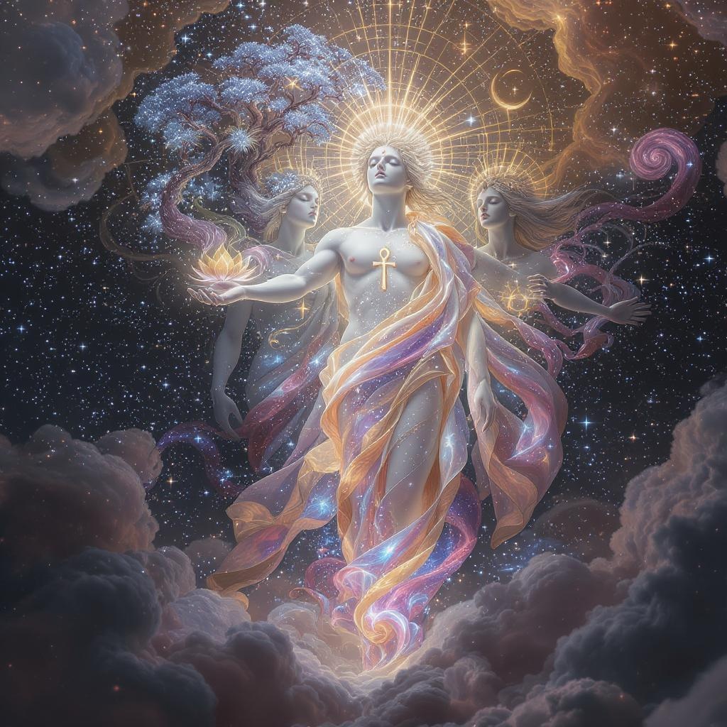 Raytraced render and digital painting of humans transforming into ethereal, celestial beings, adorned with the cosmos as their garments and holding sacred symbols. The style is reminiscent of Greg Rutkowski, Michelangelo Buonarroti, and Rembrandt, embracing neoclassical and classical influences. The scene embodies a cosmic and luxurious elegance, featuring ornate details with vibrant, vivid colors. Smooth, soft billowing smoke intertwines with contrasting darkness and bright, heavenly elements. Swirling cosmic flowers, nebula vines, and twirling nebula trees create a mystifying atmosphere. The composition is cinematic, featuring high contrast and HDR qualities, similar to artworks on ArtStation and CGSociety. Rendered with Unreal Engine, the imagery incorporates symbolism and a magical, mystical aura, evoking intrigue and wonder. Utilizing advanced techniques from ZBrush and Octane, the piece achieves a hyperrealistic quality with a bokeh and depth of field effect.