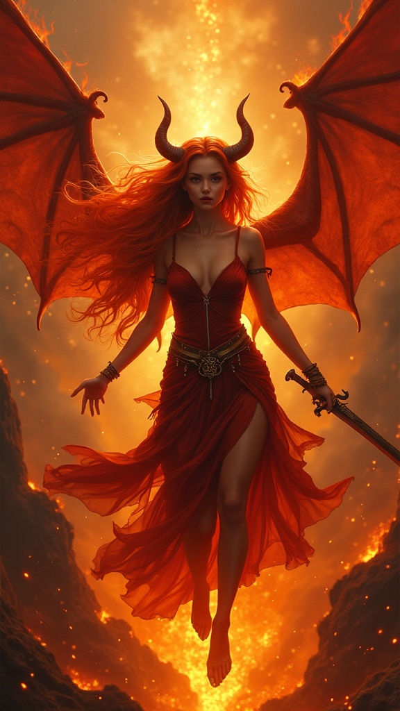 A majestic, real-life female succubus with batwings and flowing fire hair, emerging from a sea of flaming magma and lava. Her detailed face, framed by a cascade of fiery colors, glows with a magic, dreamy aura. She is hovering mid-air, surrounded by fantasy and D&D-inspired elements, with enchanting particle effects adding to the atmosphere. The scene is captured in a professional digital painting style, evocative of Artstation concept art, with influences from Artgerm, Greg Rutkowski, Alphonse Mucha, Loish, and WLOP. The composition features photorealism and 8k resolution, with crisp lighting and a detailed, lifelike background that's trending on Tumblr. She wears a dramatic gown, accessorized with a wand and sword. The painting evokes a sense of motion and mystery, with a focus on intricate details, while avoiding any distortion of features or anatomy, maintaining elegance and allure throughout.