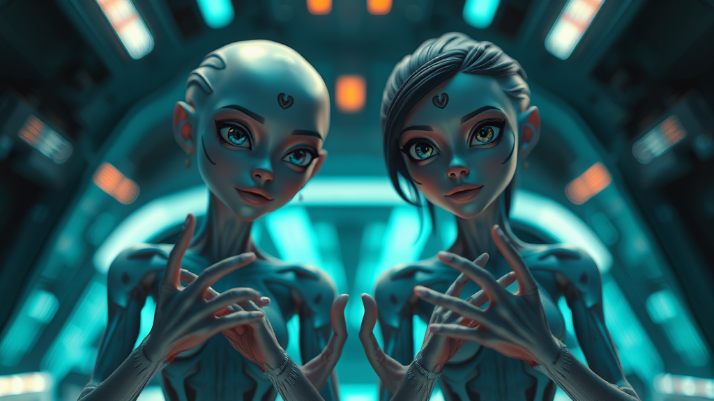 Realism depth of field futuristic sharp focus cinematic lighting perfect composition 8k UHD HDR realistic animation dual subjects unique features elongated limbs intricate hands ethereal atmosphere vivid details high resolution seamless rendering flawless integration clear expression dynamic scene enhanced textures pristine clarity immersive ambiance distinct characteristics unblemished aesthetic photorealistic quality cohesive narrative.