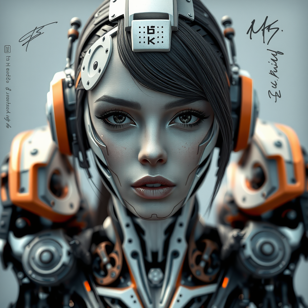 Realistic 3D photograph of a woman with robotic components, featuring intricate hard surface design, showcasing a VFX character with high detail and sharp focus. The image is UHD and HDR, capturing the essence of trending artwork on art platforms. The composition includes a touch of artistic imperfection with subtle elements like intentional blur, slightly exaggerated proportions, and abstract signatures, hinting at a watermark, and fragmented text to evoke a sense of narrative depth.