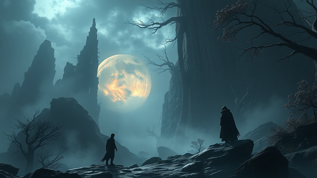 Realistic and intricate dark fantasy scene with hyper-detailed environments and characters, rendered in Full HD and 8K quality, infused with immersive lighting and volumetric effects, akin to next-gen Unreal Engine visuals. A compelling concept art piece that combines elements of shadow and light, featuring mystical landscapes and enigmatic figures, drawing inspiration from trending themes on Artstation, with dynamic and atmospheric composition.