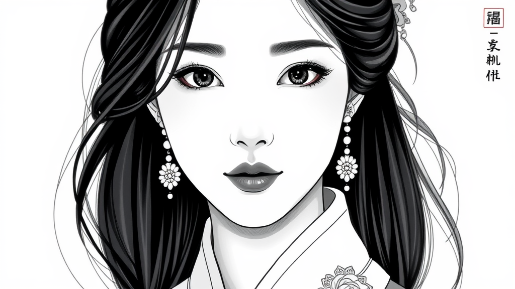 Realistic black and white illustration of an elegant Korean woman, minimalist white backdrop, emphasizing delicate facial features with subtle embellishments in her attire, hinting at traditional elements, with an artistic flair blending modern and classic styles, creating a harmonious balance of beauty and grace.