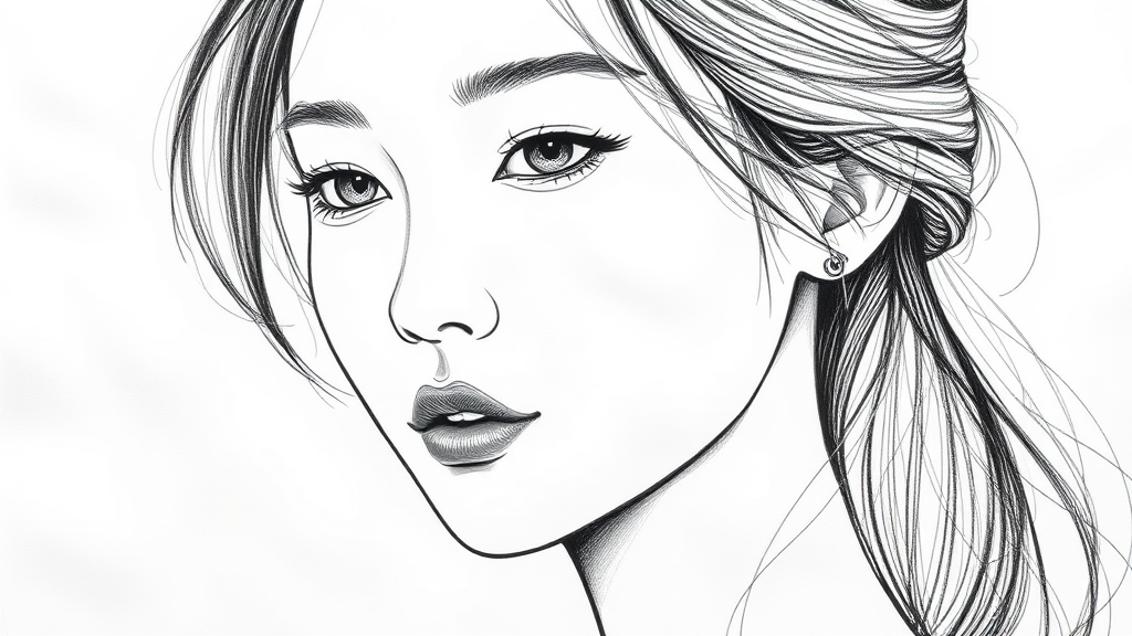 Realistic black and white sketch of an elegant Korean woman with delicate features, set against a minimalistic white background. Emphasize subtle details and play with shadow and light to enhance her serene expression and flowing hair, capturing a timeless beauty.