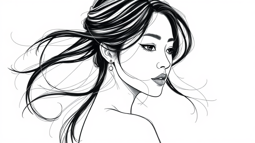 Realistic black and white sketch of an elegant Korean woman with flowing hair, minimalistic background, high contrast --ar 61:128 --stylize 750 --v 6.1