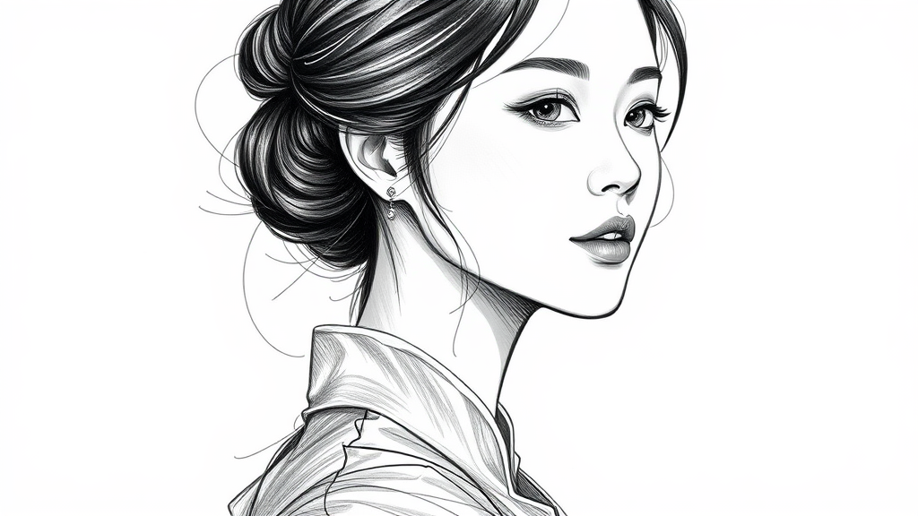 Realistic black and white sketch of an elegant Korean woman, detailed features and expressive eyes, set against a simple white background. Subtle artistic embellishments enhance her graceful posture, capturing both modern and traditional elements in her attire, with an emphasis on delicate textures and soft shading for depth and dimension.