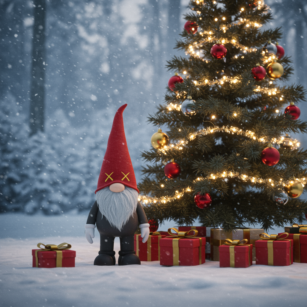 Realistic CGI scene of a New Year tree adorned with glowing ornaments, accompanied by a Scandinavian Christmas gnome reimagined in a contemporary art style similar to KAWS, all set against a winter forest backdrop with a soft gradient of colors. Rendered using advanced techniques for lifelike detail, such as Unreal Engine and Octane, the scene captures the magical and artistic essence of the season.