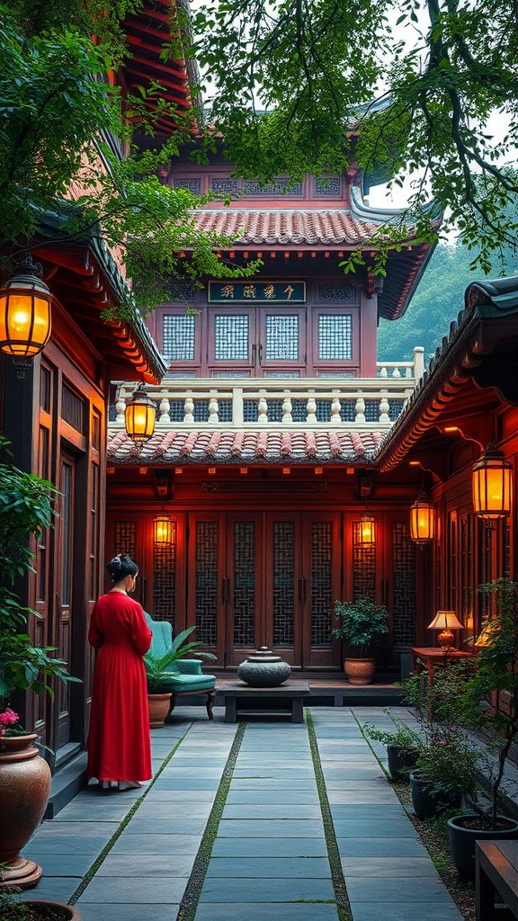 Realistic cinematic 8k high quality Chinese tea house Asian traditional attire aspect ratio 16:9 serene atmosphere lush garden intricate architectural details vibrant colors cultural elements gentle ambient lighting harmonious balance of nature and design