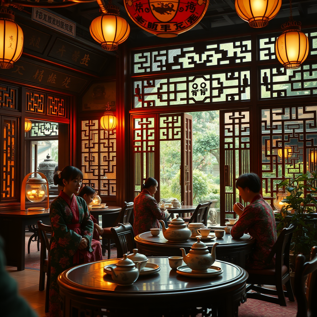 Realistic cinematic 8k high quality Chinese teahouse scene showcasing intricate details, featuring people in vibrant traditional Asian attire, warm ambient lighting highlighting ornate woodwork, delicate tea sets on tables, lush garden visible through open windows, all captured in a stunning ar16:9 composition.