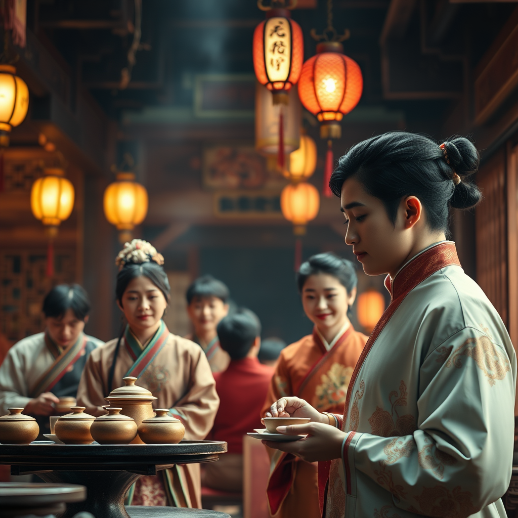 Realistic cinematic 8k high quality Chinese teahouse scene featuring a group of individuals in traditional Asian attire, set against a serene backdrop of wooden architecture and delicate lanterns, capturing the rich ambiance and cultural essence in stunning detail with an emphasis on vibrant colors and intricate patterns.