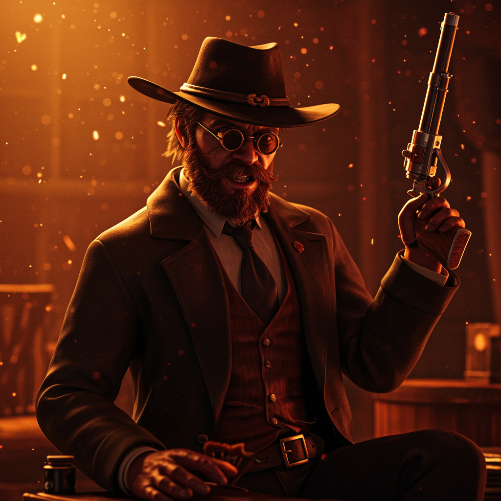 Realistic cowboy steampunk scene featuring warm, vivid colors creating an inviting yet mysterious atmosphere, rendered in ultra HD 8k with exquisite detail and quality. A digital art masterpiece with glowing accents and hand-drawn elements, crafted using Octane Render, Cinema 4D, and Blender for a dark and atmospheric touch. The composition captures a cinematic, sensual vibe with sharp focus, offering a humorous twist in its illustration. The depth of field is expansive, crafting a sense of majesty akin to a professional oil painting by artists like Ed Blinkey, Atey Ghailan, Jeremy Mann, Greg Manchess, and Antonio Moro. This hyperrealistic and colorful concept art, trending on ArtStation and CGSociety, showcases intricate high detail and dramatic focus, reminiscent of photorealistic paintings by Midjourney and Greg Rutkowski, presented in UHD, HDR, 8K, featuring a diverse character model with a sushi mix color palette.