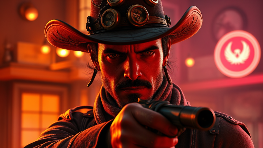 Realistic cowboy steampunk scene with warm, vibrant colors, executed in ultra HD and 8K with high detail and quality. The scene is digital art featuring glow effects and a hand-drawn feel, rendered using octane render and crafted in cinema 4d and blender. It exudes a dark, atmospheric allure with cinematic sensuality and sharp focus, blending humor with intricate detail. The illustration boasts a wide depth of field, achieving masterpiece quality akin to professional oil paintings by Ed Blinkey, Atey Ghailan, Jeremy Mann, Greg Manchess, and Antonio Moro. It's resonant with the trending styles on ArtStation and CGSociety, hyperrealistic with vivid colors and a modelshoot vibe. The artwork maintains the essence of photorealistic painting art by Midjourney and Greg Rutkowski, rendered in UHD, HDR, and 8K, reflecting a Dark Sushi Mix Colorful model, with creative tweaks enhancing its visual narrative while preserving the core steampunk cowboy aesthetic.