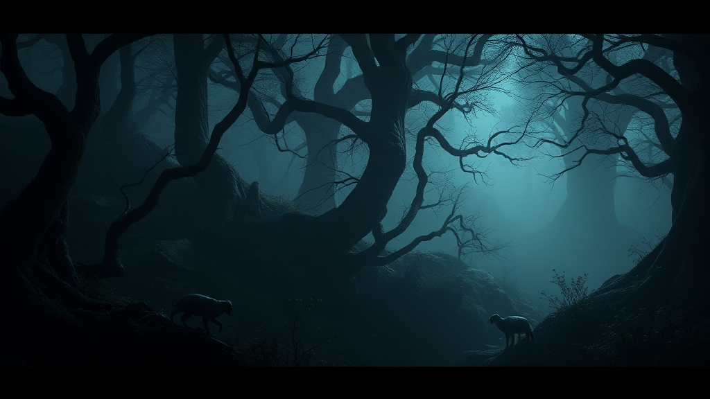Realistic dark fantasy scene with intricate details, showcasing a mysterious forest landscape illuminated by ethereal volumetric lighting, rendered in Full HD and 8K quality. The atmosphere is rich with shadows and contrasting light, capturing the essence of an enchanted realm. Subtle hints of mist weave through twisted trees, while otherworldly creatures peek from the undergrowth. Designed with Unreal Engine precision, this concept art is seamlessly trending on Artstation, offering a captivating blend of realism and fantasy allure.