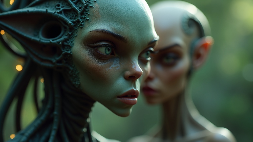 Realistic depiction with intricate depth of field, combining Sci-Fi elements with sharp focus and cinematic lighting for an impeccable composition in 8k UHD HDR. Featuring the model ReV Animated v1.21, characterized by unique features such as elongated neck, an unusual number of fingers, and subtly distorted facial attributes that convey a sense of otherworldly mutation. The scene is devoid of any logos, watermarks, or text, ensuring clean and high-resolution imagery, free from any blurring or digital artifacts. The focus remains within frame for a seamless and immersive visual experience.