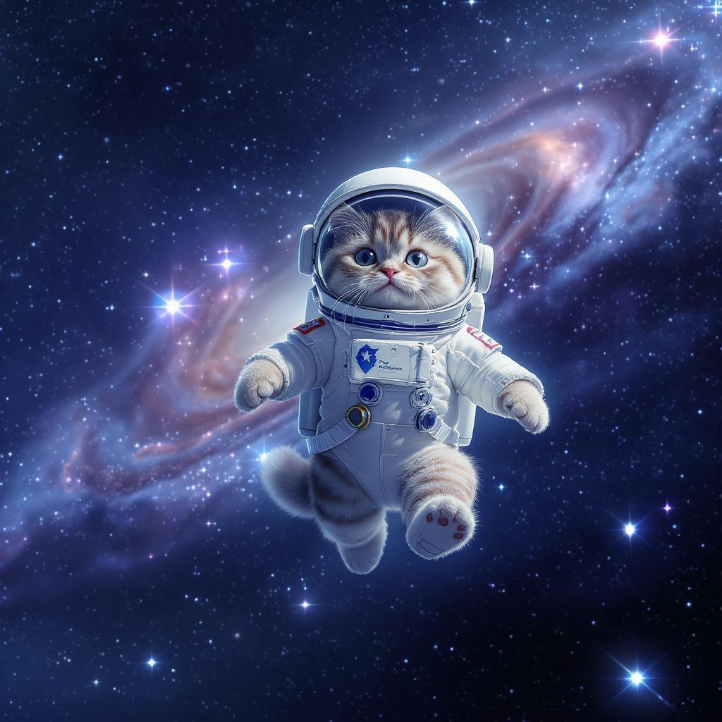 Realistic depiction of a cute cat in an astronaut suit, floating in space, rendered in ultra-high-definition, showcasing an 8k resolution, with vibrant stars and galaxies in the background, cat's helmet reflecting the colorful cosmic scenery.