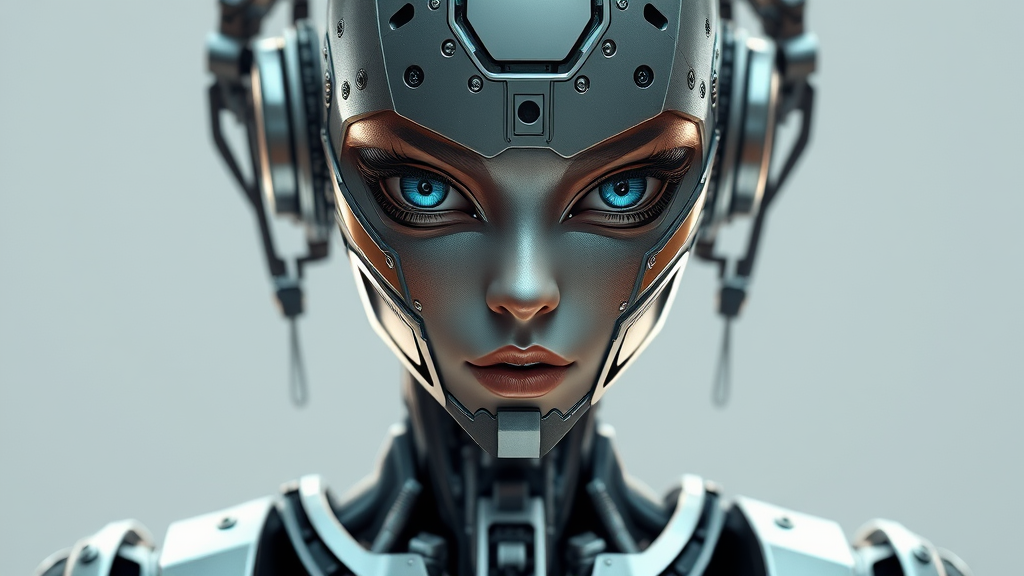Realistic depiction of a female cyberpunk-inspired robot, showcasing a highly detailed and symmetrical design with intricate mechanical features; the character has a complex, digital 3D appearance with hard surface elements, captured in real-time with advanced VFX. The ultra HD and HDR rendering highlights the abstract metal elements within her structure, blending illustration and cartoon influences. The robot boasts a cyborg aesthetic, featuring asymmetrical components and facial features, including a mouth and subtle openings. Despite the high level of detail, the image conveys a sense of movement, avoiding out-of-frame elements, and steers clear of bad or grossly exaggerated proportions. The visual is clear, without signatures, words, descriptions, or watermarks intruding upon the design.