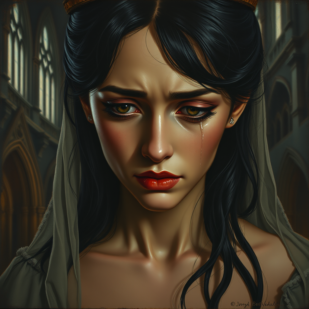 Realistic epic painting of a woman deeply weeping, her expression laden with profound sadness, her eyes red and swollen from tears, eyebrows knitted in sorrow, nose flushed, cheeks glistening with moisture, lips parted slightly. She has cascading black hair and exquisitely detailed eyes and ears, capturing a dramatic intensity. The style reflects the intricate brushwork of French painter Alexandre Cabanel, employing an oil painting technique. She is adorned with a delicate veil and wears an elegantly simple neckline, set against the backdrop of an old Gothic cathedral bathed in dim, moody lighting, conveying a sense of melancholy. Her eyes are dark, adding to the gothic allure, with atmospheric, shadowy illumination enhancing the somber mood. Avoid elements like neon, 3D effects, cartoonish aspects, anime influence, sketches, low resolution, standard quality, acne, distorted anatomy, oversized features, or exaggerated musculature, and ensure precise detailing without deformations.