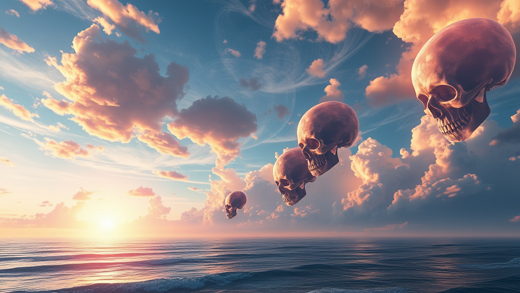 Realistic fantasy sky background intertwined with ethereal skull motifs, illuminating a breathtaking seascape, reminiscent of ZBrush artistry; vibrant hues and transcendent beauty evoke wanderlust and the essence of transavanguardia movement.