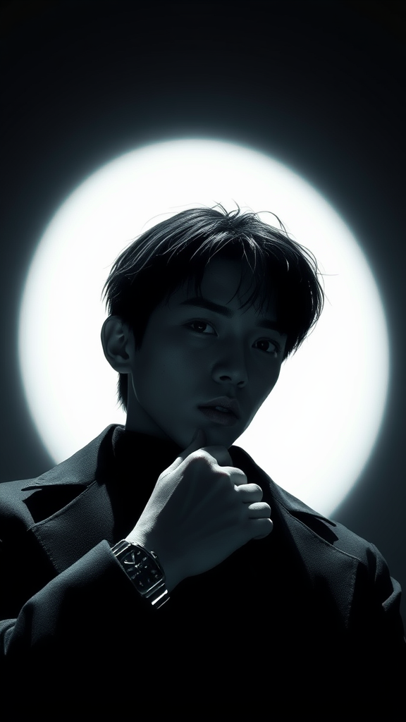 Realistic film noir visual with a central figure in stark black, white, and deep blue tones, reminiscent of Yoh Nagao's style, emphasizing light and shadow effects elements; High ratio of white (71:128) with prominent stylization (750) bringing focus to key elements rather than details; Character wears attire in darks with subtle contrasts, illuminated only by a steady intense light source coming from the left:.:.:.:.: detail in facial features minimalized, focus on ensuring visible, high-contrast confidence and concern cycles distinctly embedded in the facial expressions around the timepiece and mysterious attire.