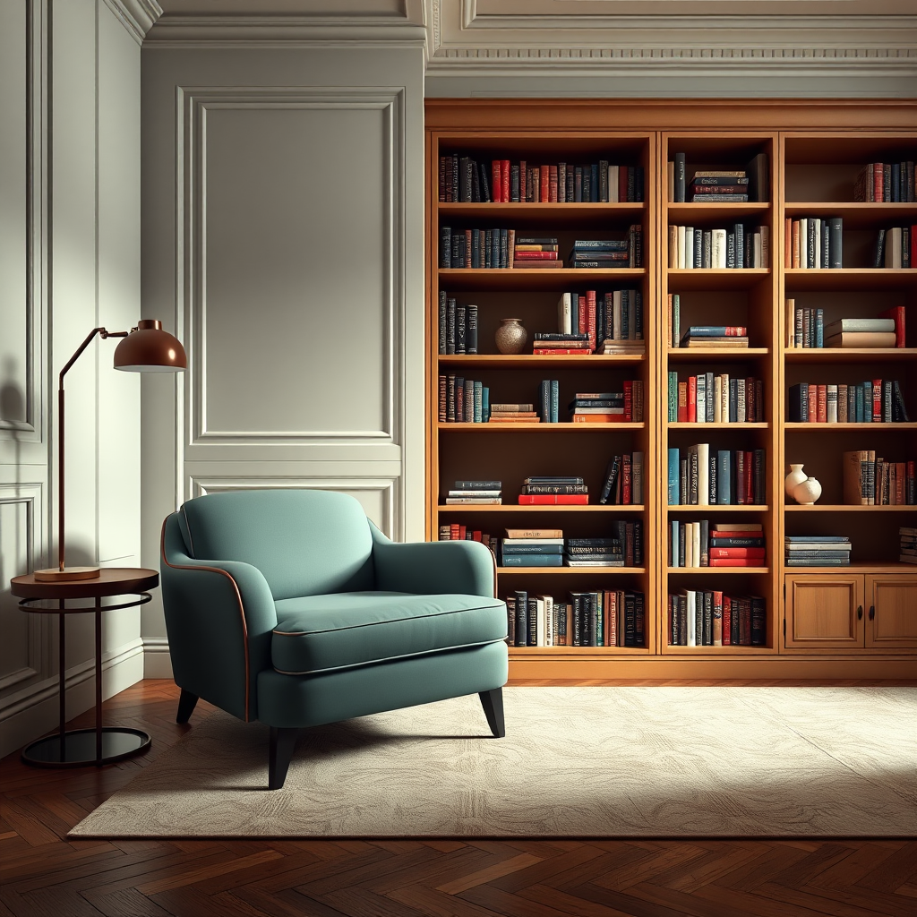 Realistic image depicting an elegant armchair and bookshelf arrangement, featuring high-quality design, a harmonious blend of triadic colors, bold and expressive lines, and a touch of porcelain aesthetics, captured in an appealing 3:2 aspect ratio.