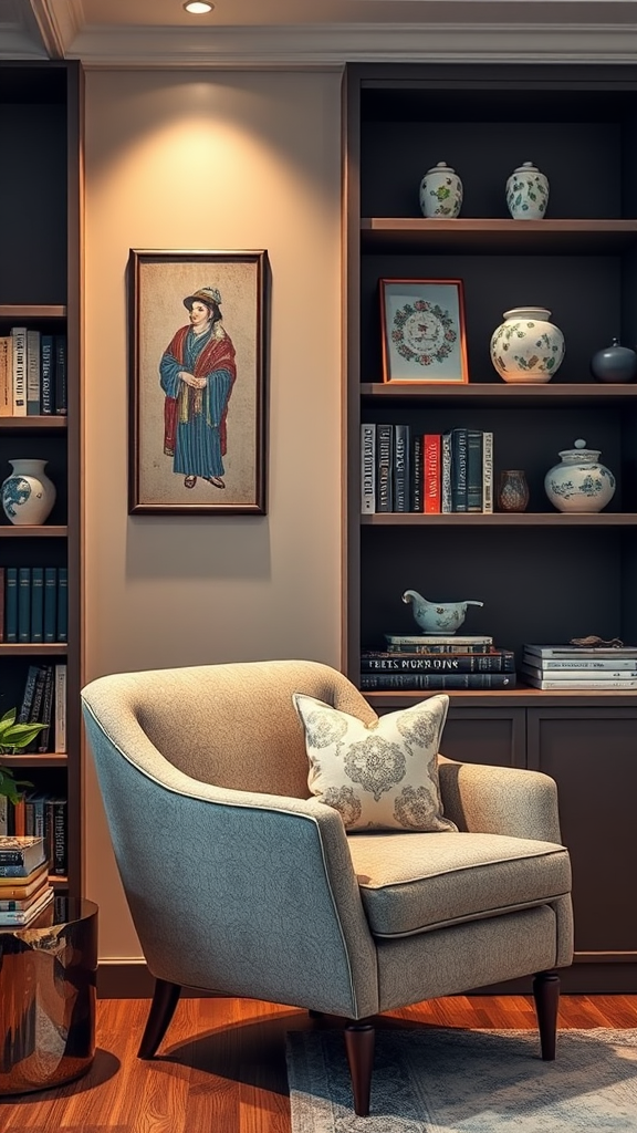 Realistic image of a cozy armchair next to a stylish bookshelf, featuring triadic color scheme with bold strokes, accents of porcelain decor, refined textures, warm lighting, and a harmonious atmosphere, aspect ratio 3:2.