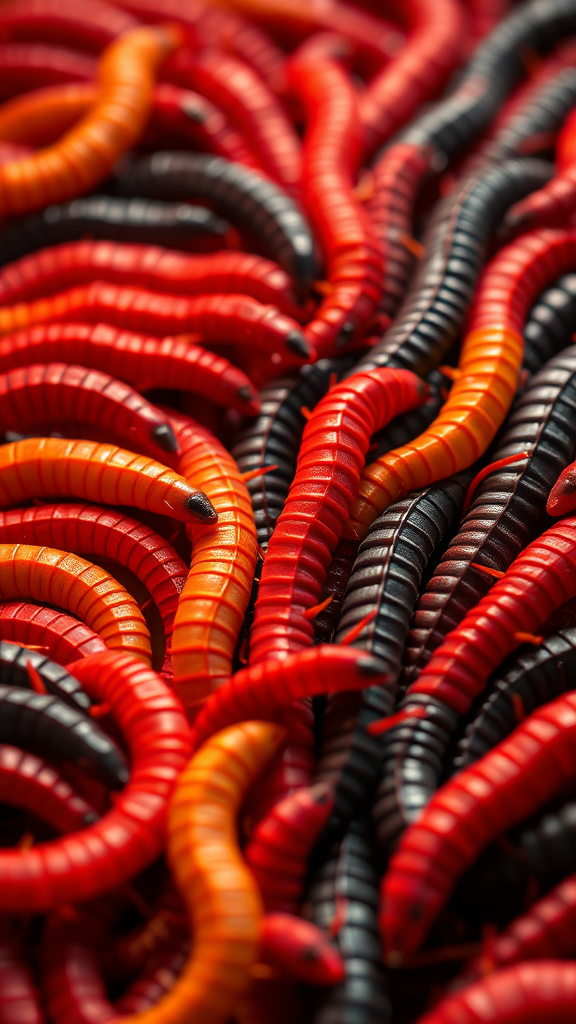realistic macro photo by NatGeo of an array of colorful flat worms arranged meticulously, with a touch of shimmering sparks, vibrant and playful kitsch elements, dramatic studio lighting, featuring bold reds and blacks reminiscent of the eva 02 palette, captured in stunning 1080p with vray rendering quality