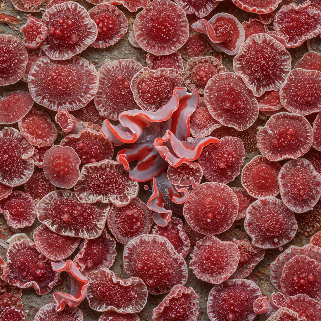 realistic macro photo by NatGeo of an array of flatworms meticulously arranged, featuring vibrant bursts of light, kitschy details, and bright studio lighting, incorporating bold reds, whites, and grays reminiscent of eva 02 palette colors, rendered in high definition with vray quality.