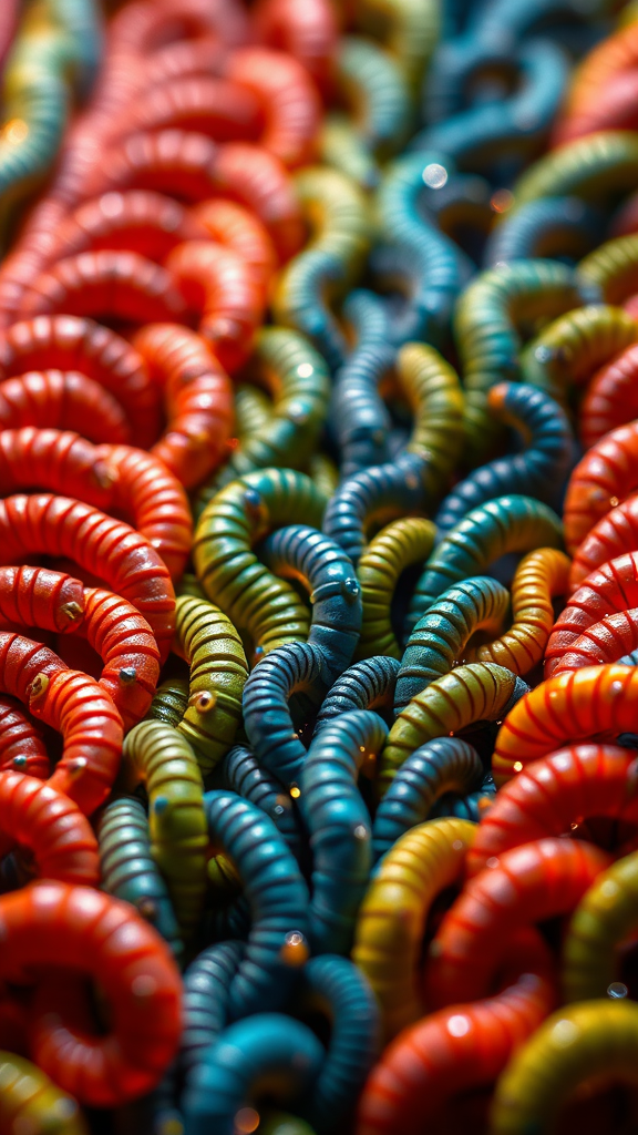 Realistic macro photo inspired by NatGeo showcasing an array of colorful flat worms meticulously arranged in a knolling pattern, subtly sparkling with energetic glimmers, infused with a playful kitsch aesthetic, illuminated by dramatic studio lighting, featuring vibrant EVA 02 palette colors, high-resolution detail, rendered with vray for stunning clarity.