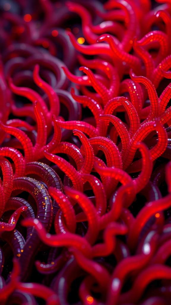 Realistic macro photo inspired by NatGeo showcasing a meticulously organized assortment of flatworms, vibrant with lively sparks and a kitsch aesthetic, illuminated under precise studio lighting. The palette is reminiscent of the Eva 02, featuring striking reds, purples, and contrasting hues, rendered in stunning clarity with 1080p detail using Vray for a hyper-realistic finish.