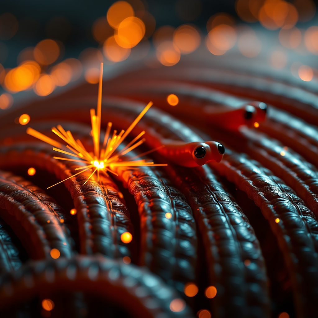 realistic macro photograph of neatly arranged flat worms, emitting tiny sparks, with a hint of kitsch style, captured under studio lighting; inspired by eva 02 palette colors, creating a vibrant and captivating composition; rendered in high-definition, vray quality