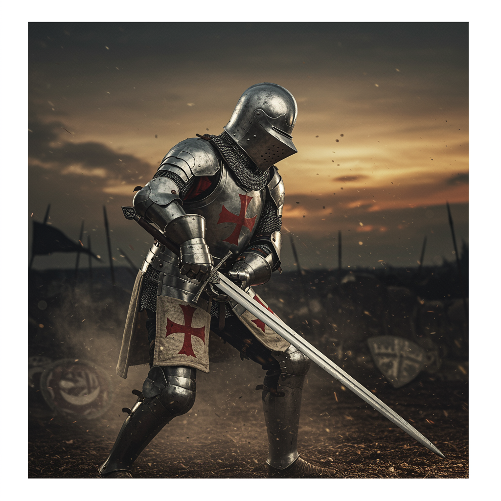 A highly realistic medieval knight in full body armor is depicted mid-action, wielding a long sword with expert precision. The scene captures intricate details of the armor's ornate engravings and the knight's determined expression. Ambient light glints off the polished metal, creating striking reflections and shadows. The setting suggests an ancient battlefield, with hints of a distant castle silhouetted against a twilight sky, adding drama and depth to the composition. Dust and movement give the scene a dynamic, almost cinematic quality while maintaining the essence of the chivalrous warrior.