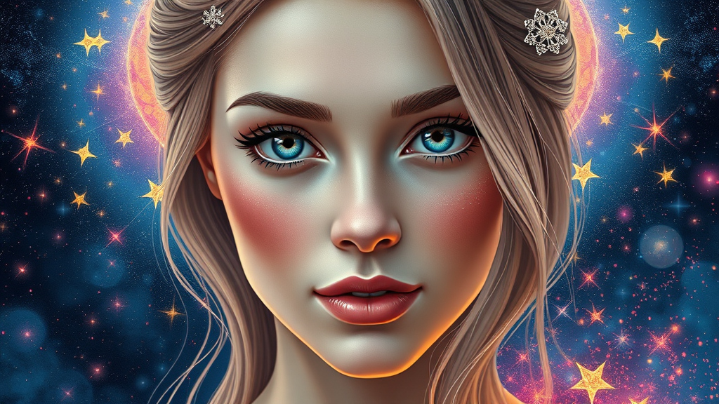 Realistic photo portrait of Scarlett Leithold infused with cosmic energy, vivid and colorful bursts, showcasing her beautifully symmetrical features with a serene, kind expression, round expressive eyes; tone-mapped, intricately detailed, and elegant, employing digital painting techniques. Inspired by ArtStation concept art, the illustration maintains a sharp focus, exuding a dreamy, magical ambiance. Influences from Artgerm, Greg Rutkowski, and Alphonse Mucha are evident, achieving a sophisticated, highly detailed visual in 4k and 8k resolution, with a creative twist on the ethereal and enchanting theme.