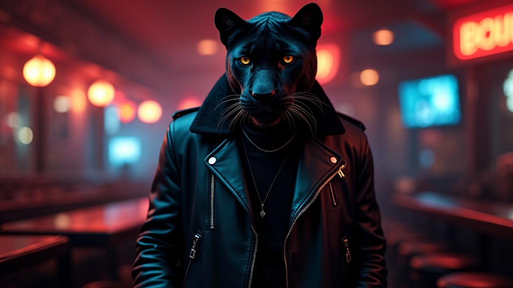 A stunning and hyper realistic photograph captures the essence of an anthropomorphic panther exuding modern athleticism, clad in a sleek biker outfit. He stands confidently in a dimly lit midnight bar, where the ambiance evokes admiration and awe. The hyper detailed textures of his fur and clothing glisten under epic dark lighting, creating an emotional and captivating atmosphere. Shot in 32k UHD resolution with the precision of a Hasselblad H6D 400c Multi-Shot, equipped with a Mitakon Speedmaster 35mm f/1.2 XCD lens, the composition is masterful. The subtle glow of neon lights and reflections play off his form, enhancing the mystique and allure of the scene.