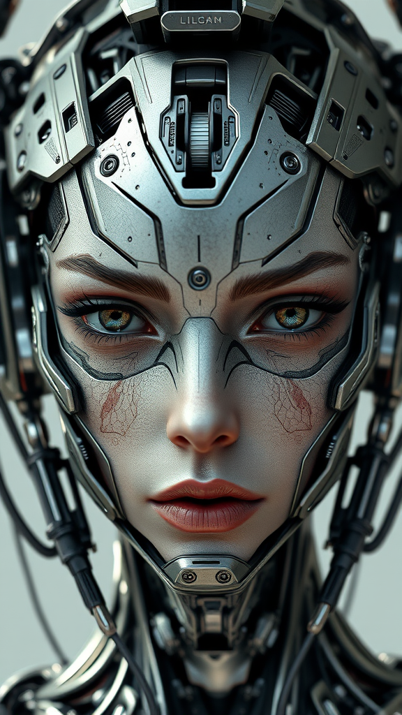 Realistic photograph of a female cyberpunk android, character design, detailed and symmetrical face, highly intricate and mechanical detailing, digital 3D rendering, hard surface textures, real-time elements, sophisticated VFX, ultra HD quality, abstract metallic sculpture influences, cyborg aesthetics, slight asymmetry, visible mouth, strategically designed openings, edge of frame composition, unconventional proportions, captivating character, no signatures or text, vivid and clear image quality, exceptional design without artificial enhancements.
