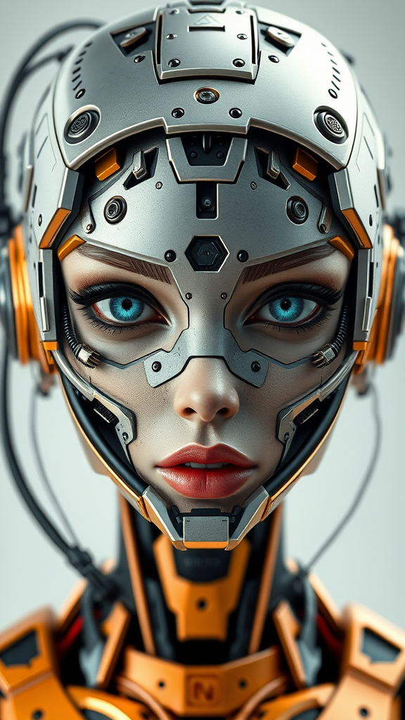 Realistic photograph of a female cyberpunk android, character design featuring a detailed and symmetrical face with intricate mechanical elements, digital 3D model showcasing hard surface technology, real-time rendering with advanced VFX, ultra HD quality capturing the essence of an abstract metal sculpture, blending illustration and cartoon styles, unique cyborg aesthetic with asymmetrical features, expressive mouth, elements slightly out of frame, artistic imperfections, purposeful blur effects, unconventional proportions, devoid of signatures or text.