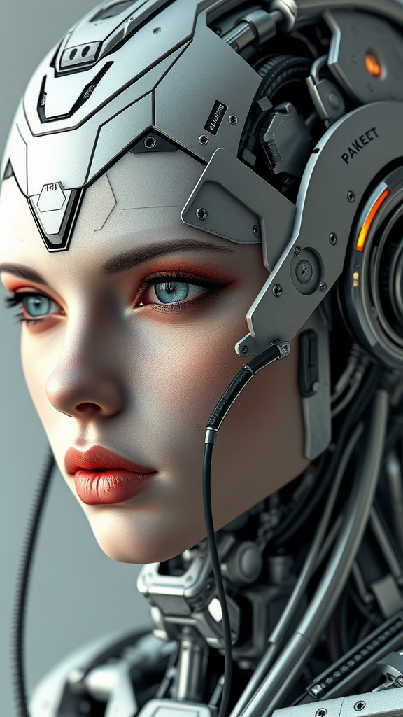 Realistic photograph of a female cyberpunk android, character design, detailed face with high precision, intricate symmetrical features, digital 3D render, hard surface texture, real-time rendering, advanced mechanical design, high-quality VFX, ultra HD finish, HDR effect, abstract metal sculpture elements, artistic illustration style, hybrid cyborg appearance, asymmetrical components, expressive mouth, complex surface patterns, minimalist frame, unconventional proportions, avoiding signatures, text, or watermarks.