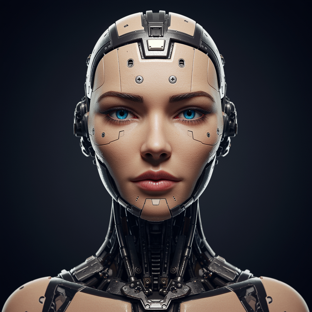 realistic photograph of a female cyberpunk android, intricate character design, detailed facial features, high precision, symmetrical digital 3d model, real-time rendering, mechanical construction, vfx elements, ultra hd quality, hdr abstract metallic sculpture, illustrative and slightly cartoonish cyborg elements, asymmetrical accents, visible mouth, out-of-frame elements, avoiding poor art aspects and unnatural proportions, free of any signature or watermark.