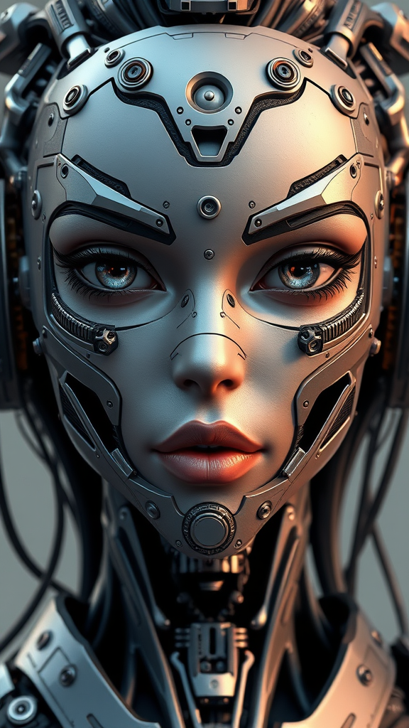 Realistic photograph of a female cyberpunk nousr android with character design elements, featuring a highly detailed face adorned with intricate and symmetrical mechanical details, set in a digital 3D render showcasing hard surfaces and real-time lighting effects. The composition highlights an ultra HD, HDR depiction of abstract metal sculpture elements, blending illustration and cartoon styles in the representation of a cyborg character. The design includes unique asymmetrical features such as a mouth with distinct apertures, all crafted with careful attention to proportions to maintain visual harmony. The image is free from signatures, words, descriptions, and watermarks, ensuring a clean and professional presentation.