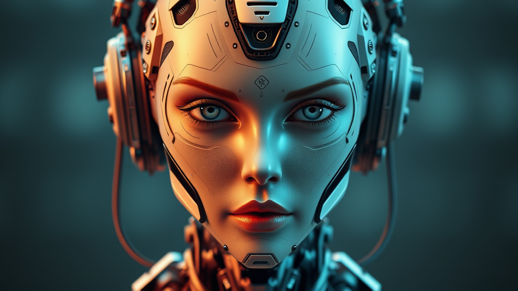 Realistic photograph of a female cyberpunk robot, featuring a highly detailed face and intricate symmetrical design with mechanical elements. Showcasing a digital 3D hard surface structure that appears real-time, with ultra HD and HDR effects. The robot embodies abstract metal sculpture qualities, blending illustration and cyborg characteristics with subtle asymmetry. The design avoids undesirable elements like blurred or disproportionate features, ensuring clarity and cohesiveness. The composition remains unblemished by external inscriptions or watermarks.