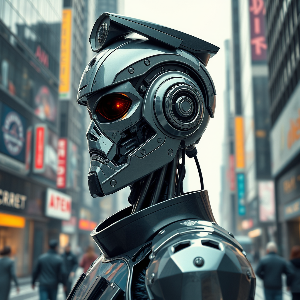 Realistic photograph of a futuristic police robot in a bustling modern cityscape, cyberpunk aesthetic, striking character design, intricate and symmetrical facial details, smooth digital 3D rendering showcasing hard surface mechanical elements, enhanced with real-time VFX, ultra-high-definition HDR side profile view, abstract metal sculpture inspiration, illustrated with a hint of a cartoonish cyborg vibe, wearing unique asymmetrical clothing, featuring unexpected design elements like abstract holes and out-of-frame components, intentionally challenging aesthetic norms with unconventional proportions and anatomy for an edgy, avant-garde appearance, without text, signatures, or watermarks.