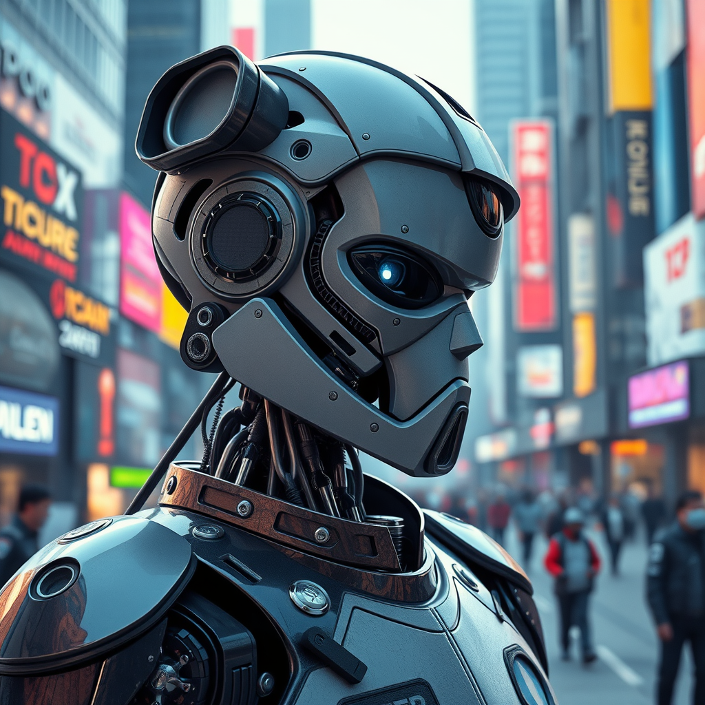 Realistic photograph of a futuristic police robot in a bustling modern city with a cyberpunk vibe, featuring a character design with a detailed and intricate face, showcasing highly detailed and symmetrical features with smooth digital 3D quality. The robot has hard surface and mechanical elements with a real-time VFX touch in ultra HD HDR. The side profile view includes abstract metal sculpture elements, blending illustration and cartoon styles for a cyborg appearance. Its asymmetrical design features clothes with strategic holes, adding complexity. Despite slight imperfections in proportions and anatomy, the robot exudes a rugged charm. There are no signatures, words, descriptions, or watermarks to detract from the visual impact.