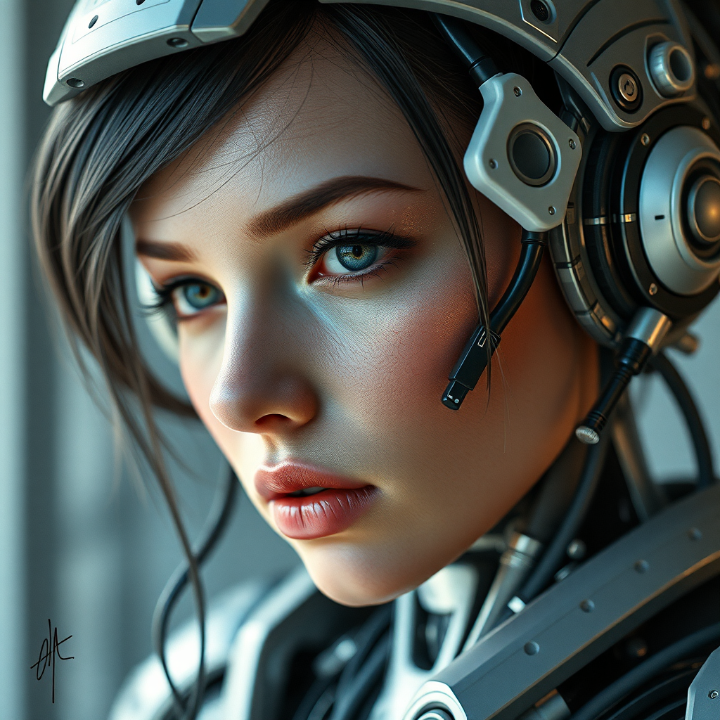 Realistic photograph of a highly detailed woman with intricate robot parts, digital 3d design, hard surface features, showcasing real-time visual effects, inspired by trending character designs on artstation, captured in sharp focus with UHD and HDR quality, slightly out of frame with intentionally imperfect proportions and a touch of distortion, including abstract signature and subtle, blurred watermark elements.
