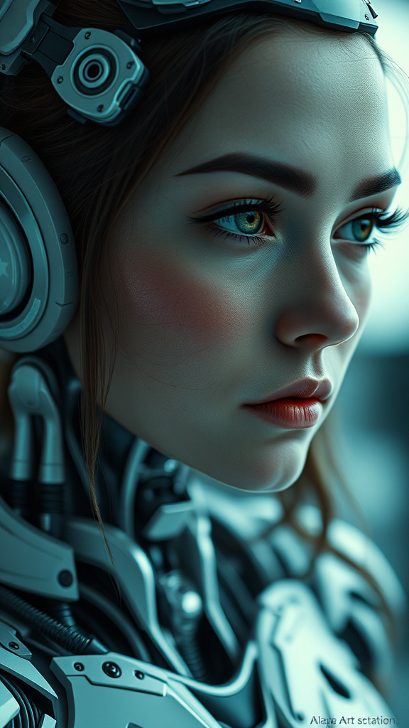 Realistic photograph of a woman integrated with robotic elements, featuring digital 3D design with hard surface detailing, showcased in a real-time VFX style. The character design is intricate and highly detailed, capturing trending aesthetics from ArtStation. The image is presented in sharp focus with UHD clarity and HDR effects, ensuring depth and vibrancy. Includes elements intentionally ‘out of frame’ for added realism. Some aspects are creatively modified to include slight imperfections like blurry edges and subtle disproportionate features, giving it a unique and artistic touch. Contains a faint signature and watermark for authenticity, along with indistinct words and descriptions interwoven within the design.